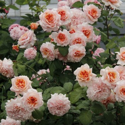 Цветки у роз этого сорта розовые, с нежной абрикосовой ноткой и желтым основанием лепестков. Пестрота в окраске отсутствует. Соцветия малоцветковые, на стебле расположено по 1-3 бутона. Сами венчики квадратные, крупные, диаметром 9-11 см, густомахровые. Количество лепестков в каждом цветке может достигать 140.